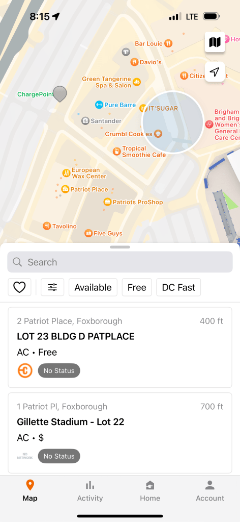 Took two trips to Patriot Place for appointments at the facilities there. I checked the place our for charging stations after reviewing a press release from October 2019 announcing 50 JuiceBox electric vehicle smart charging stations would be installed throughout Patriot Place.