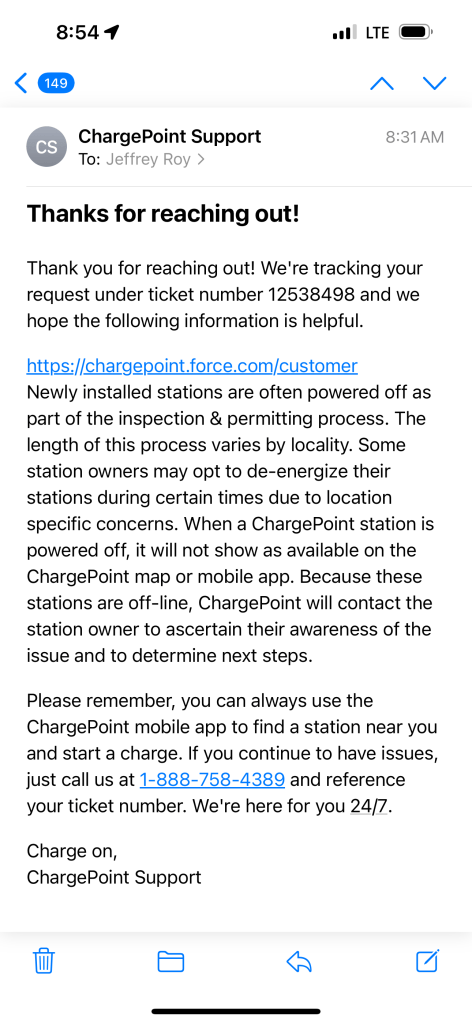 I dutifully reported the issue to ChargePoint, received a note thanking me for reporting it, and was provided a tracking number. See image below: