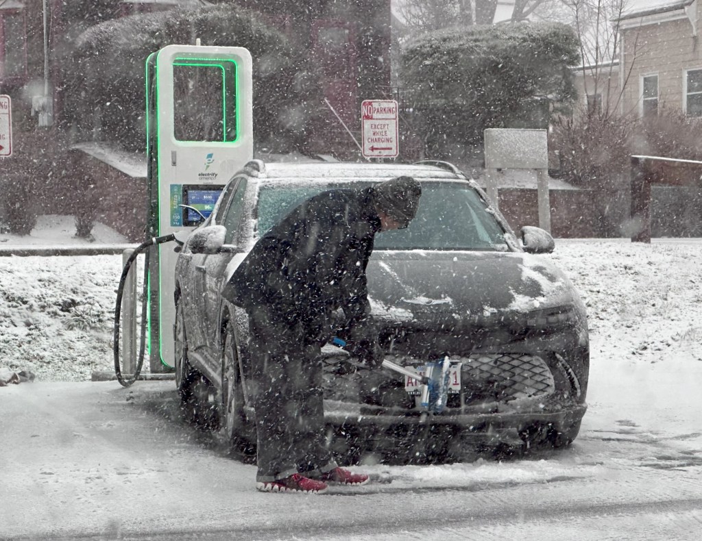 After the disappointing “three strikes, you’re out” day, and with no other choice, we ventured out in the middle of the snowstorm to accomplish what we couldn’t do on Saturday. We checked the Dorchester and Braintree stations to see how it looked. Despite the snow, they were still busy. At the Electrify America Dorchester location, one charger was out of order and all of the others were in use.