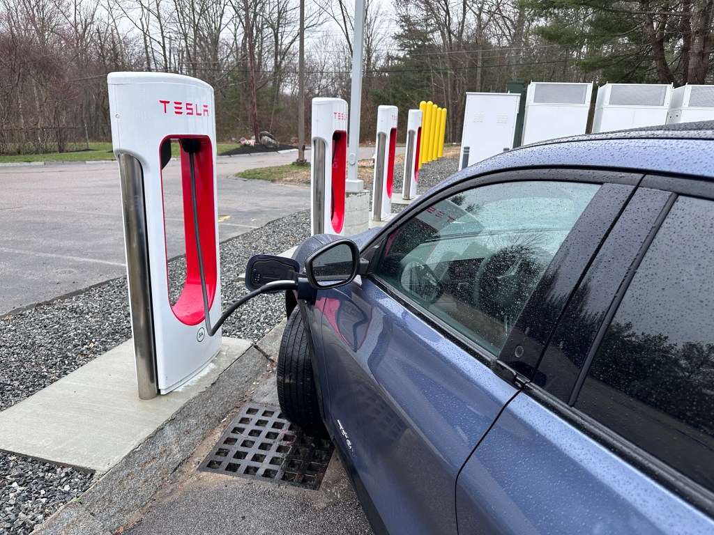I headed seven miles to the chargers just off Route 95 in Foxborough, pulled up to one of the ports, and set myself up for an experience. I learned quite quickly that the cables from the Tesla system were too short to reach the charging port on my vehicle. So, I had to virtually parallel park next to the charger in order to reach it. You can see my positioning in the photographs. That may work when all these stations are available, but I don’t think I’ll be a popular presence if they’re full.