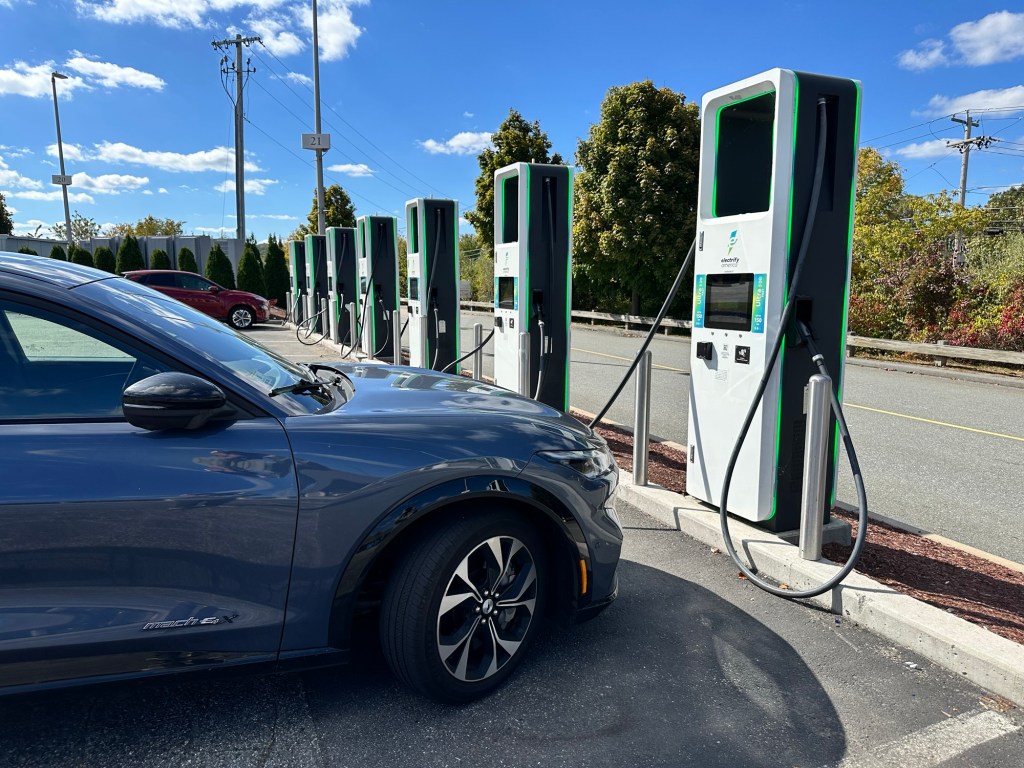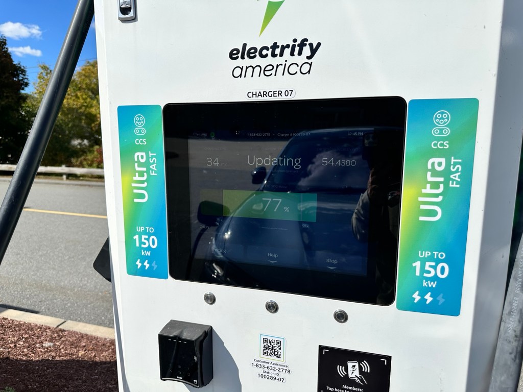 Coming home from a day in Connecticut, I was in need of a charge so we stopped at Auburn Mall off the Mass Turnpike based on past experience. They offered a line-up of seven Electrify America chargers, along with an additional 2 EVgo stations. I can’t recall seeing this much infrastructure in a non-Tesla site.